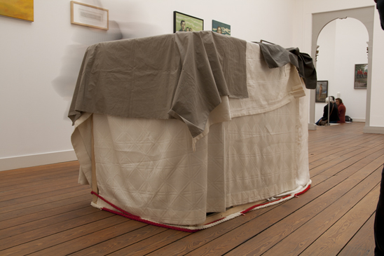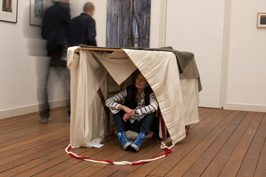 De selectiecommissie had vooraf te kennen gegeven dat ze de tent liever zagen zonder dat gebreide/gepunnikte koord. Het voegde niets toe. Ik dacht dat ze het misschien een tè lullig handwerkje vonden. Dat was tenminste mijn bedoeling. Nederland haalde toch ook zijn grenzen niet weg? Waren ze gek geworden?